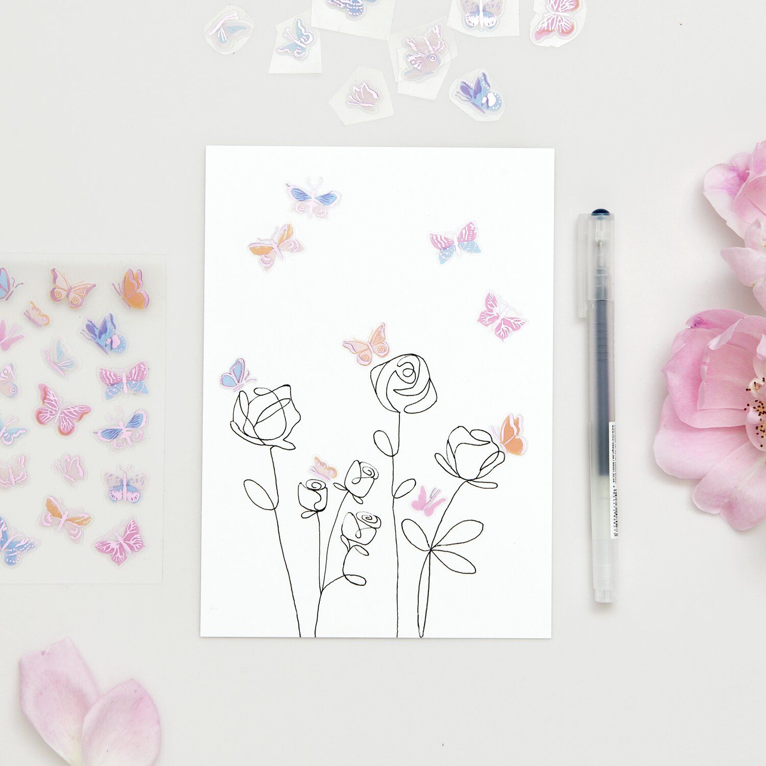 Mit den Paper Poetry Folienstickern Schmetterlinge bringst du deine Bastelprojekte sofort zum Strahlen. Jedes Set enthält 4 Bögen mit liebevoll gestalteten Schmetterlingsmotiven, die dank der glänzenden Hot Foil Details einen besonders edlen Effekt erzeugen.