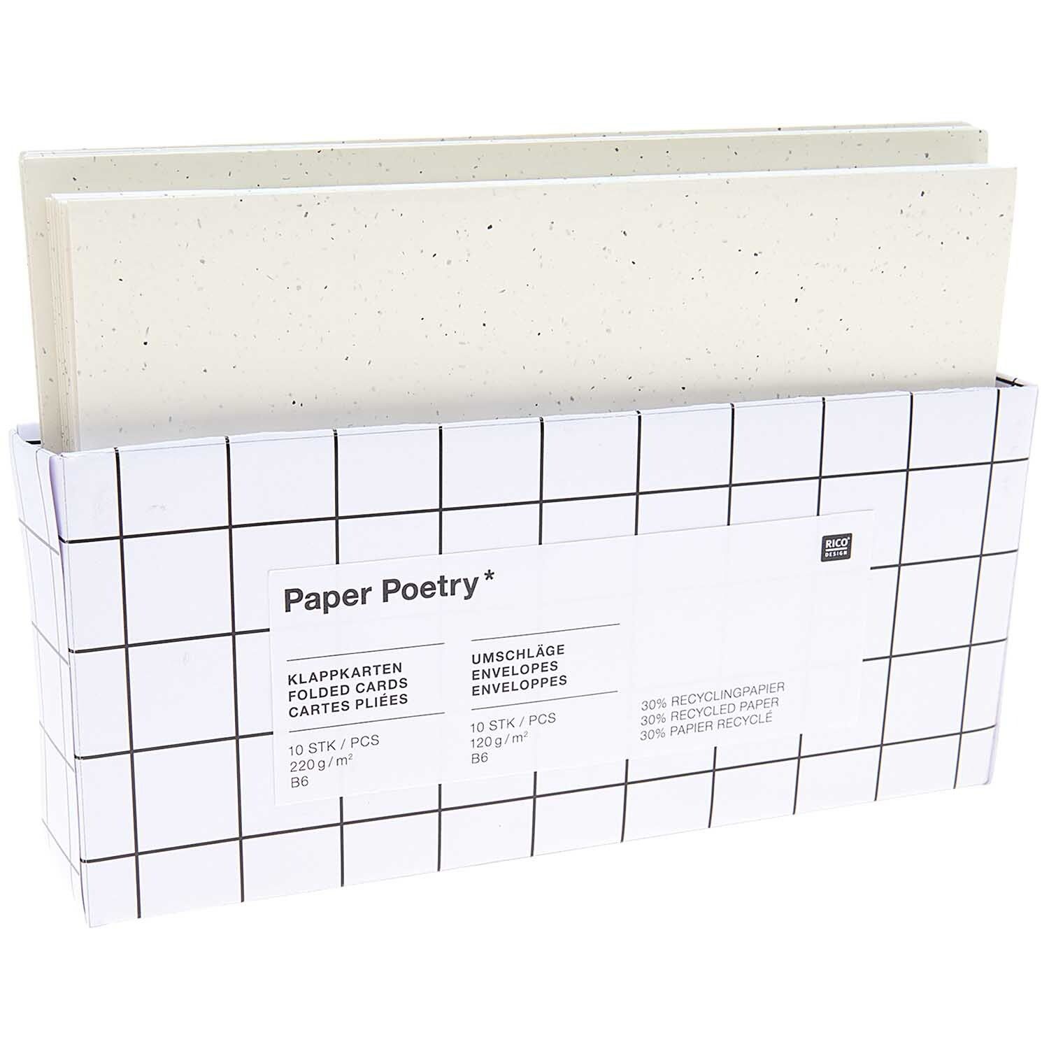 Das Paper Poetry Kartenset Elfenbein im Format B6 ist die ideale Basis für handgemachte Karten, Einladungen oder Dankesschreiben. Das Set enthält 10 hochwertige Klappkarten (220 g/m²) und 10 passende Umschläge (120 g/m²), die durch 30 % Recyclinganteil eine dezente Maserung und einen edlen, zeitgemäßen Look erhalten.
