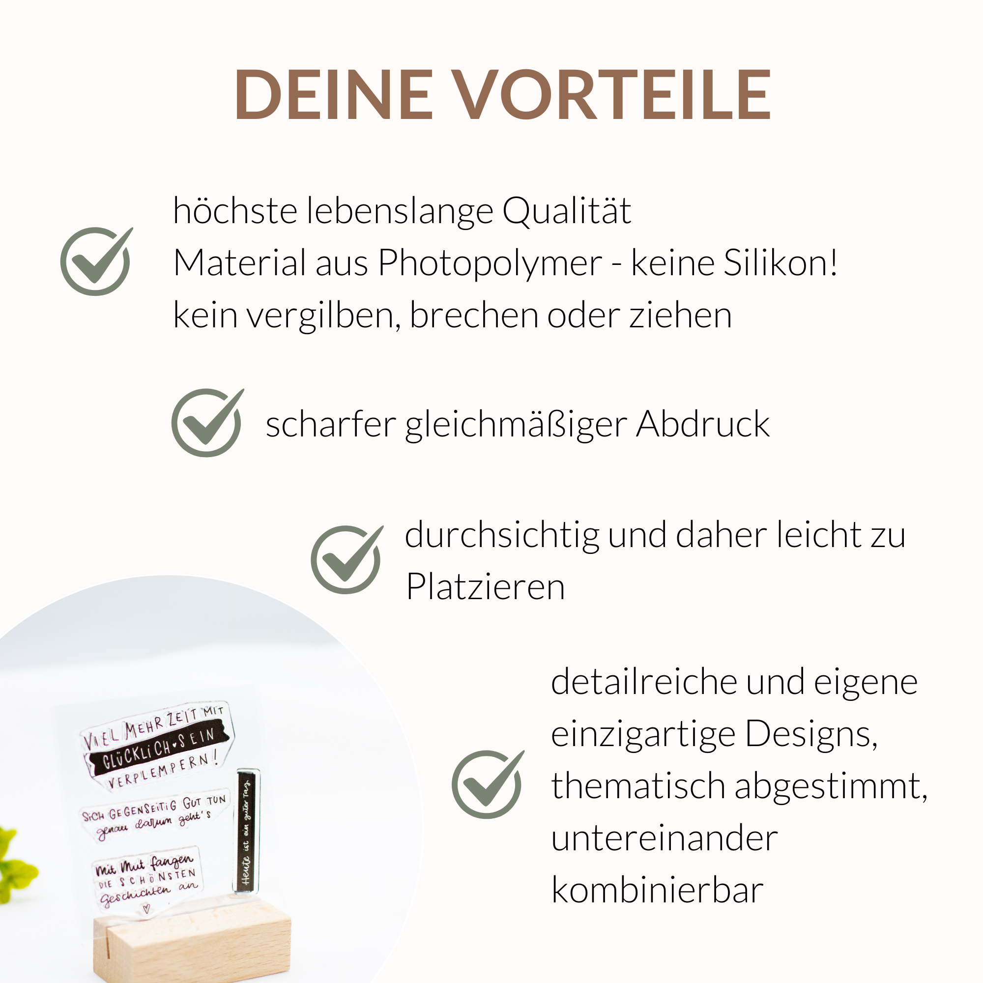 Dieses besondere Stempelset steckt voller Mut, Wärme und echter Herzensbotschaften. Aussagen wie „Viel mehr Zeit mit Glücklichsein verplempern“, „Sich gegenseitig gut tun“ oder „Mit Mut fangen die schönsten Geschichten an“ machen jede Karte zu einem kleinen Statement.