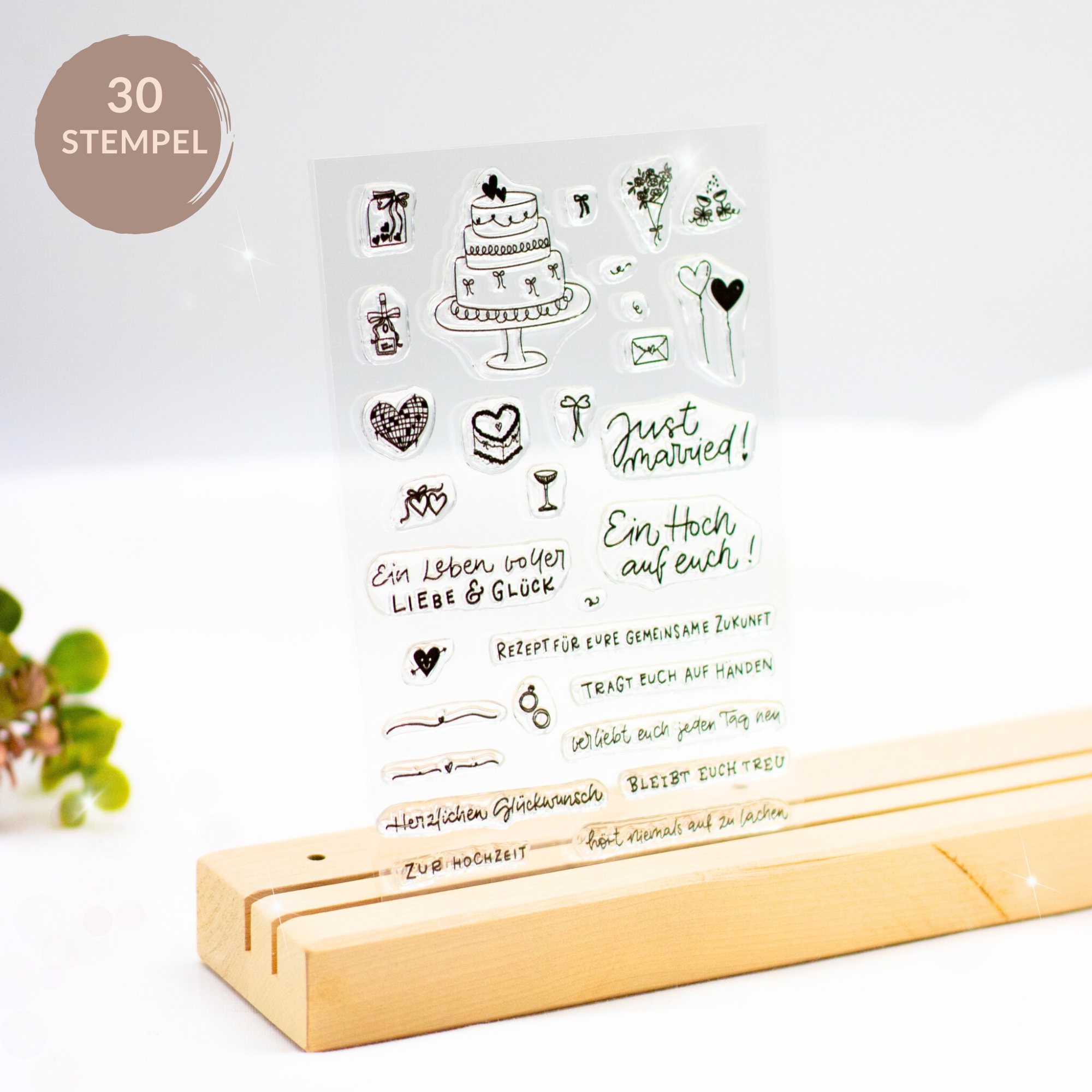 1 Stempelset Just Married mit 30 einzelnen durchsichtigen Stempeln