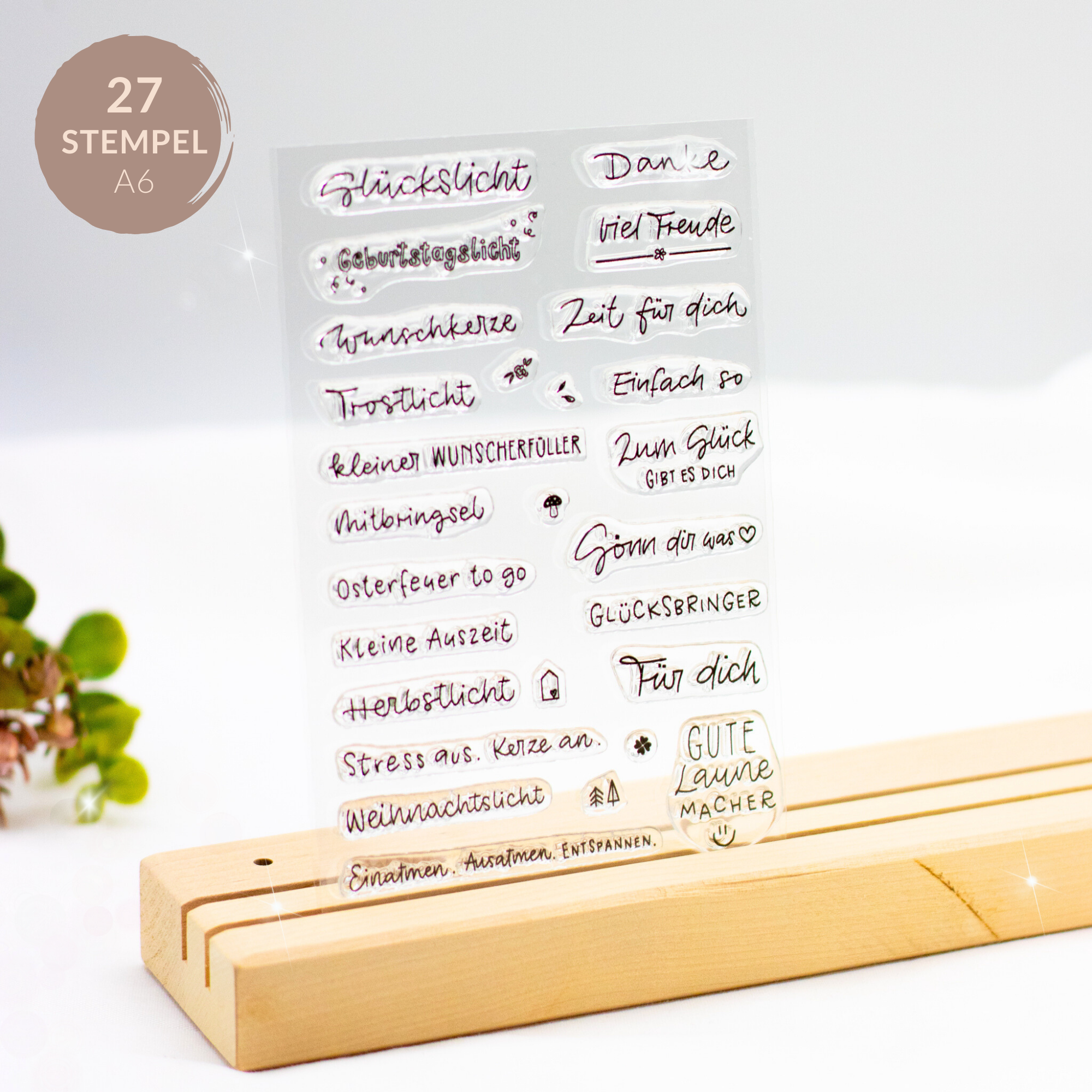 Die vielseitigen Wortspiel-Stempel wie „Glückslicht“, „Trostlicht“, „Herbstlicht“ oder „Weihnachtslicht“ lassen sich wunderbar mit Kerzen, Karten oder Geschenken mit Kerzen gestalten kombinieren. Ob auf Karten, Holzklötzchen-Deko oder personalisierten Kerzen – hier findest du Worte, die Wärme, Achtsamkeit und Herzenszeit spürbar machen. Diese Kombi bringt deine Botschaften zum Strahlen!