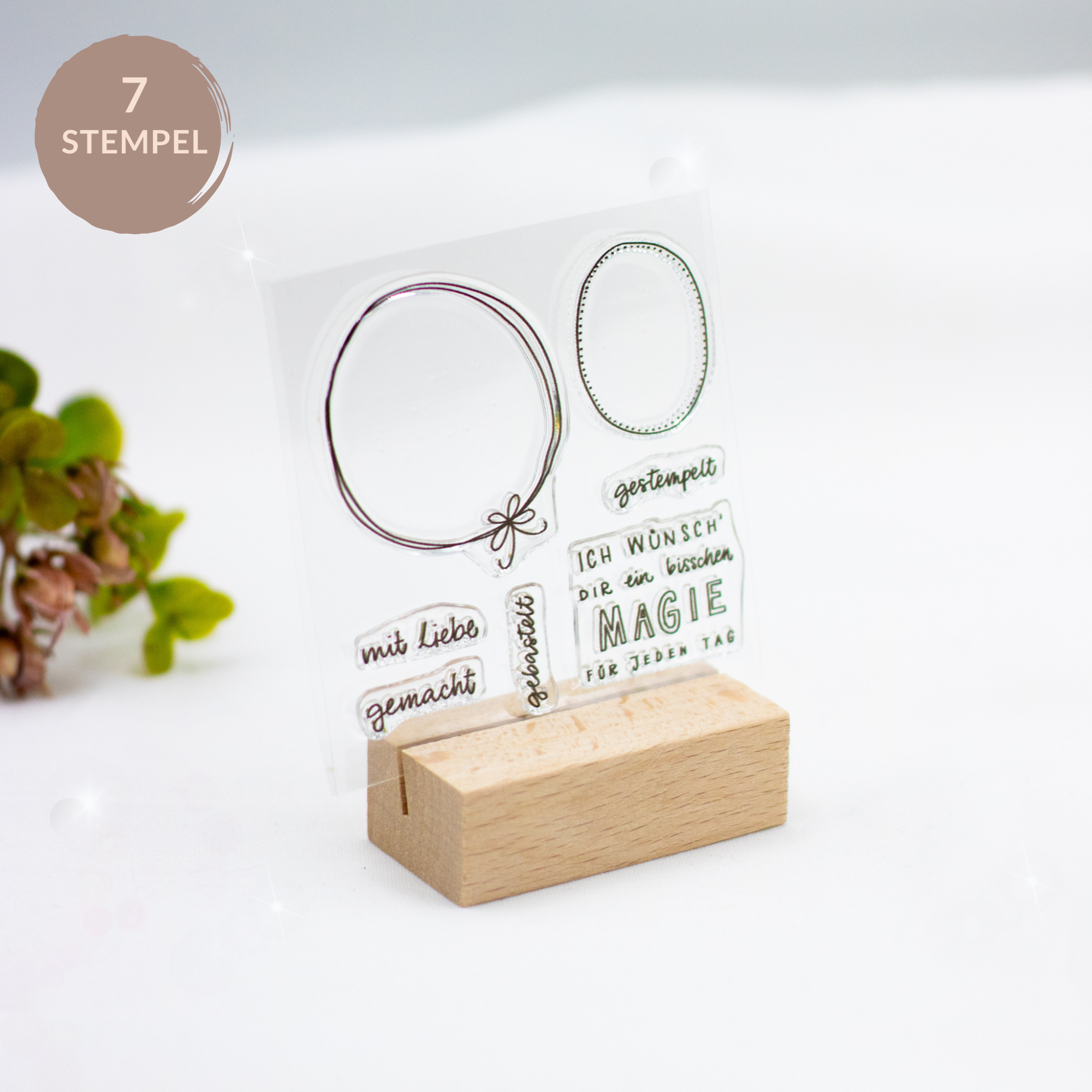 Dieses zauberhafte Stempelset vereint feine Rahmen-Elemente mit warmen Botschaften wie „Ich wünsch dir ein bisschen Magie für jeden Tag“, „mit Liebe gemacht“ oder „gestempelt“. Die zarten Ovalformen schenken deinen Worten einen besonderen Platz und machen jede Karte zu etwas ganz Persönlichem.