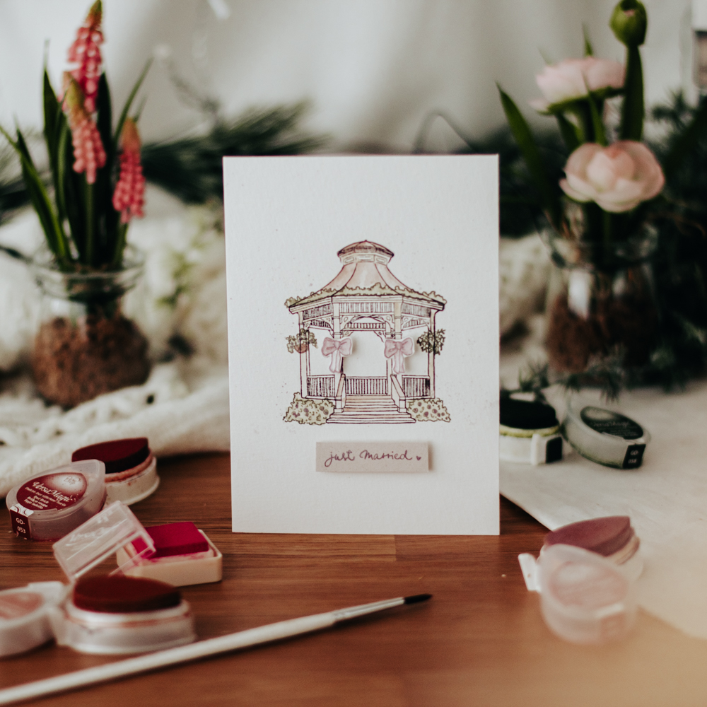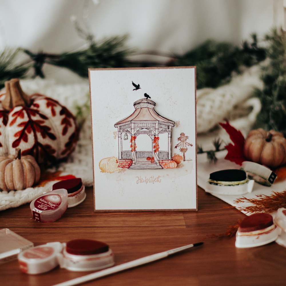 Dekoriere den Pavillon mit Girlanden, Kürbissen oder Blumen, stempel eine romantische Hochzeitsszene oder eine winterliche Marktstimmung – deiner Fantasie sind keine Grenzen gesetzt. Kombiniert mit anderen Freulebnis-Stempeln entsteht immer wieder ein neues, kleines Kunstwerk.